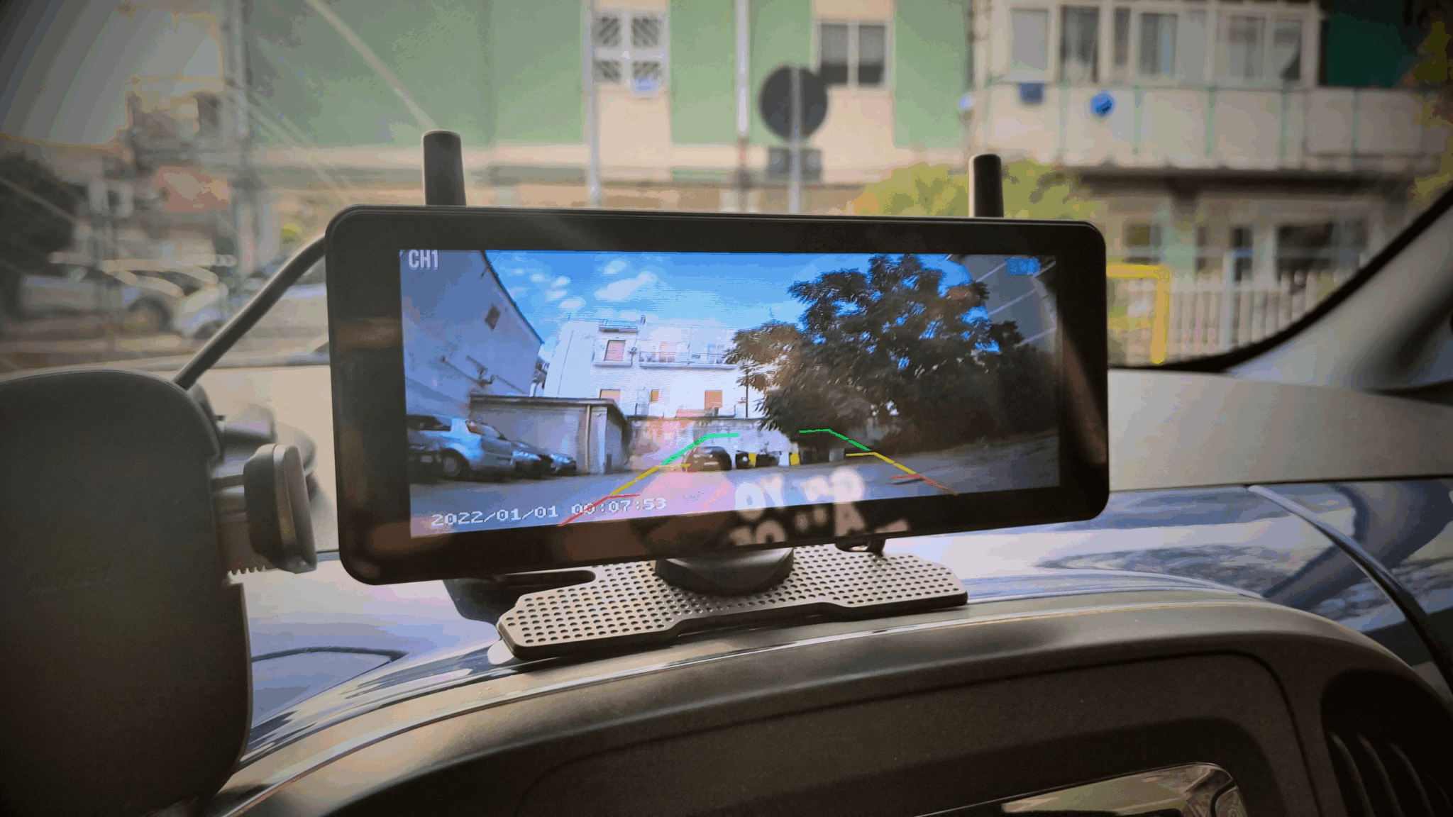 La doppia antenna sul monitor garantisce una connessione fluida, senza cali, con raggio dichiarato fino a 500 ft (circa 152 m) in campo aperto. Se questa caratteristica non aggiunge molto all’esperienza in automobile, rappresenta invece un tratto fondamentale per chi dovesse preferire questo tipo di dispositivo per un van o in generale veicoli più ingombranti come Camper o altro.