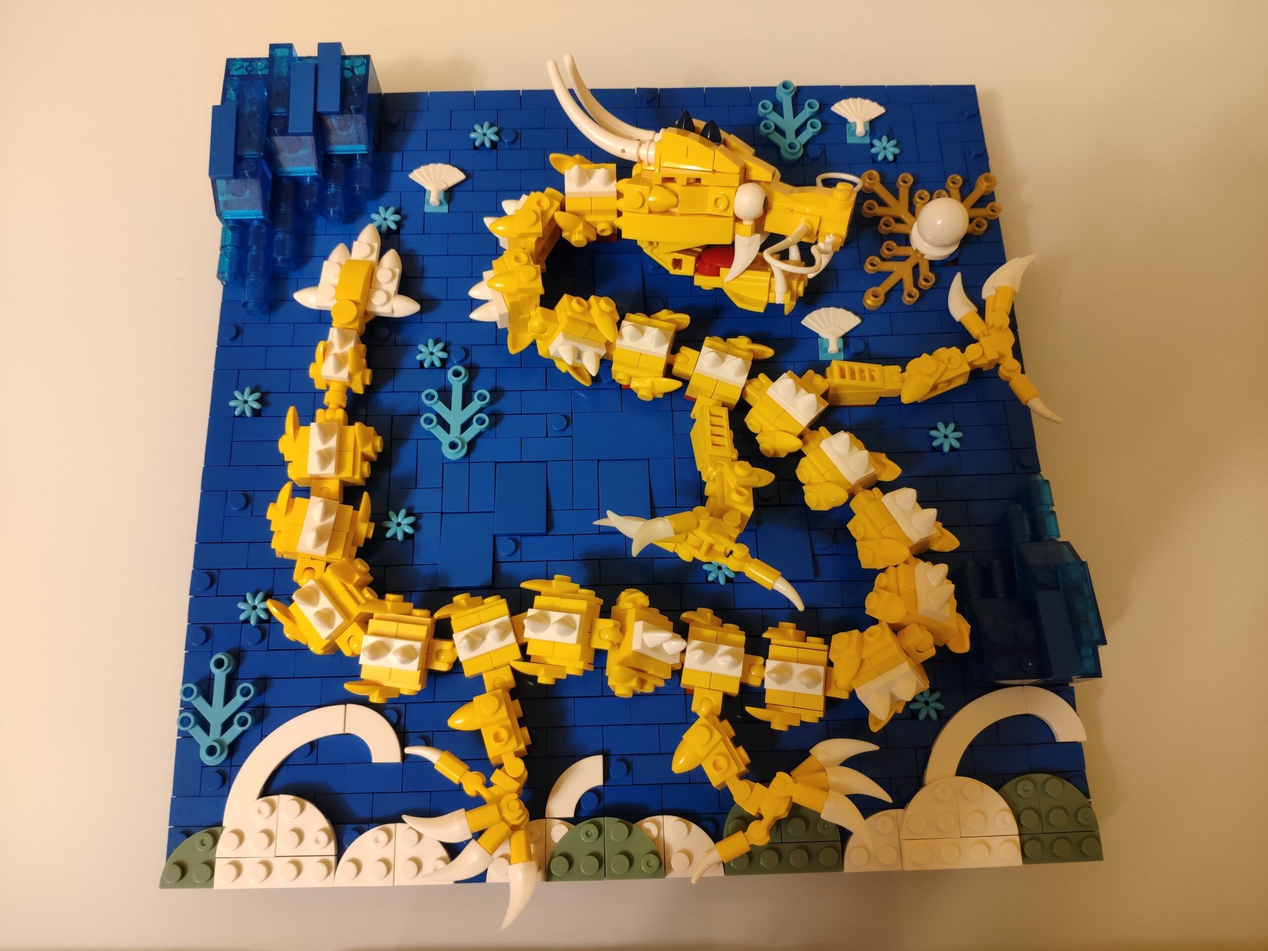 Come detto in precedenza, le istruzioni sono chiarissime e la divisione dei pezzi è perfetta. I colori sono facilmente individuabili e anche in forte contrasto. Non particolarmente impegnativa la costruzione, che consiste, fondamentalmente, nella realizzazione di una base, con tanto di supporto da tavolo (con pezzi Technic) e da parete (con forellino per inchiodarla) sulla quale vanno posti tantissimi pezzi di sfondo blu, arricchiti da agganci per le parti del drago e le altre decorazioni.