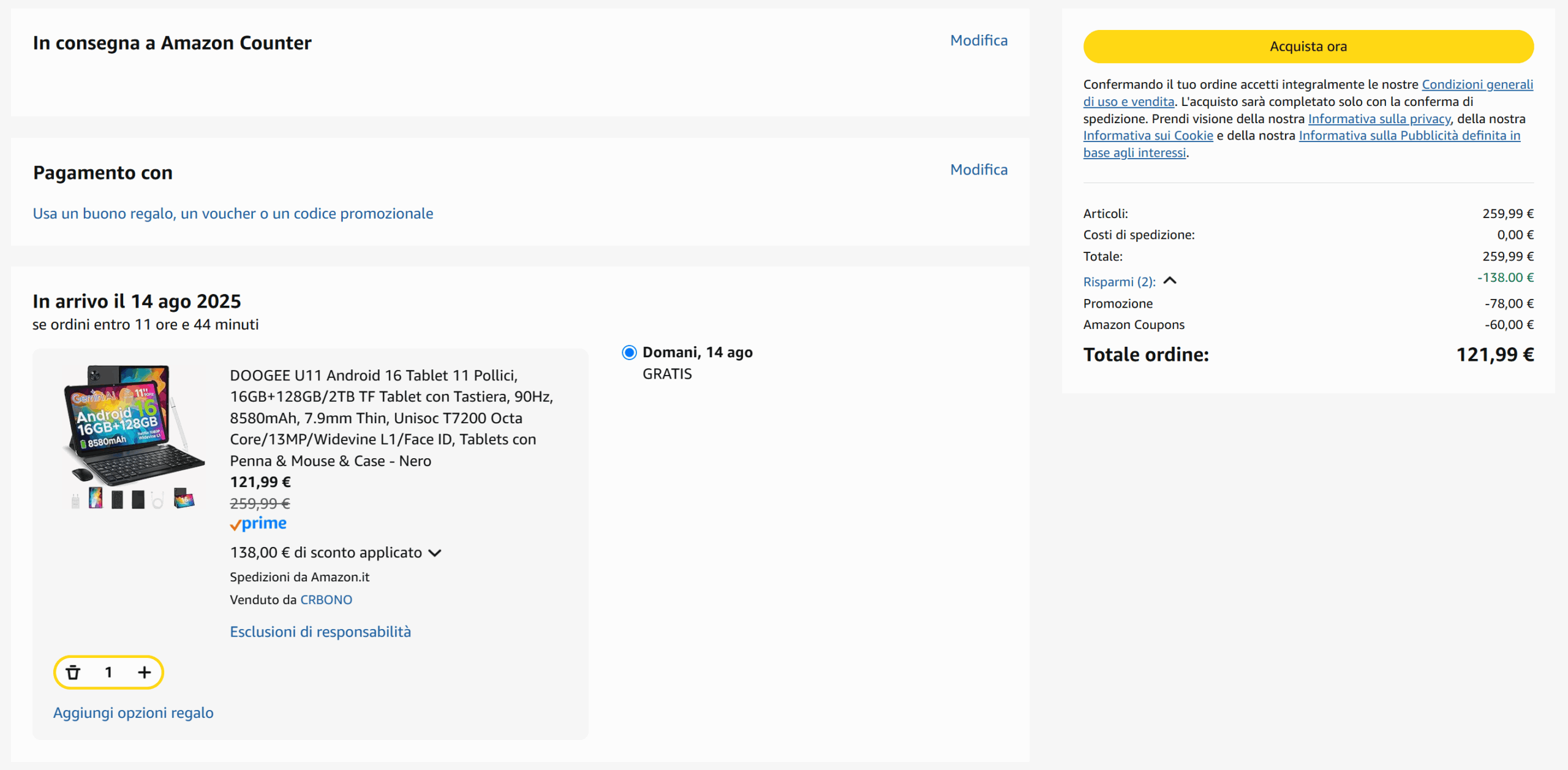 Basta spuntare lo sconto di 60€ in pagina e inserire al checkout il coupon 7V2OE95T per pagarlo soltanto 121,99€ invece di 259,99€. Un’occasione perfetta per chi vuole un dispositivo completo senza spendere una fortuna.