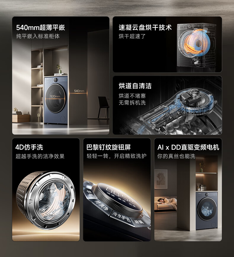 Il dispositivo nasce come frontale slim con corpo da 540 mm di profondità, studiato per rientrare nei mobili standard da 600 mm. La porta in vetro “starry-glass” da 520 mm offre buona visibilità del cestello e un look contemporaneo che si integra con cucine e lavanderie moderne.