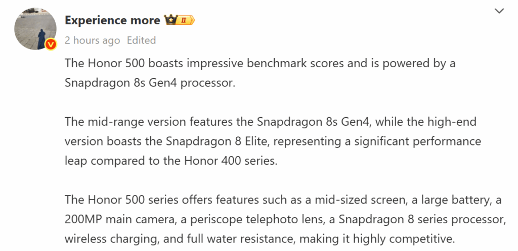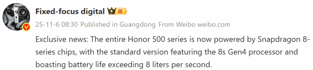 Honor 500 e 500 Pro saranno alimentati da chipset Snapdragon di fascia alta, con una batteria che potrebbe raggiungere gli 8.000 mAh. Le informazioni arrivano da diversi leaker cinesi su Weibo, tra cui Fixed-focus Digital e Experience More, oltre a un ingegnere Honor del reparto ottimizzazione prestazioni.