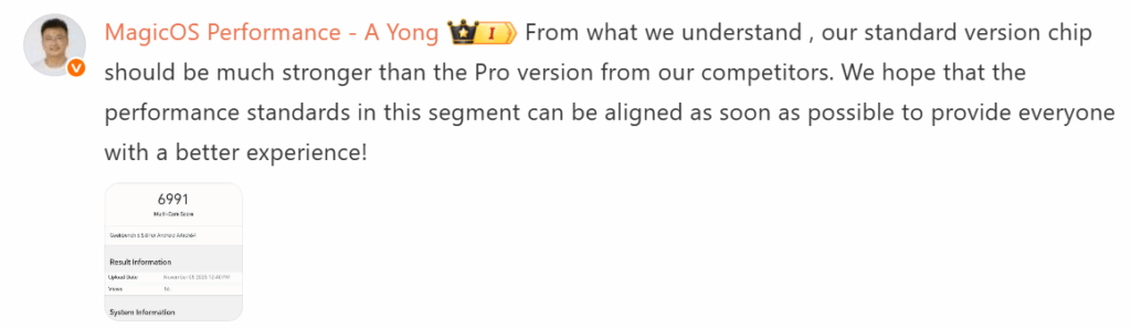 L’ingegnere Honor A Yong ha aggiunto che il modello standard della serie offrirà prestazioni superiori rispetto alla variante Pro di un diretto rivale, facendo riferimento all’Oppo Reno 15 Pro.