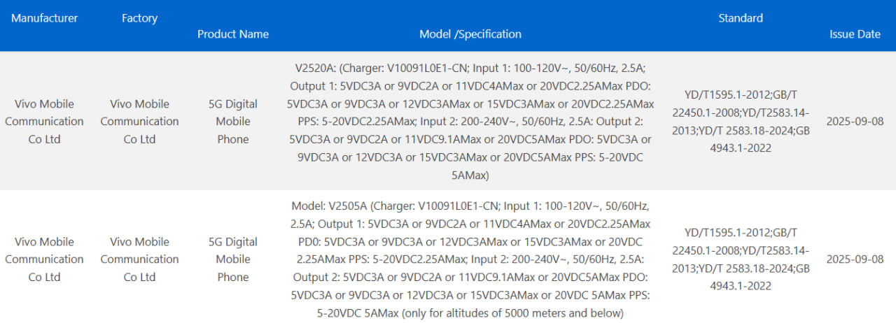 Due nuovi smartphone Vivo/iQOO sono stati avvistati nel database dell’autorità cinese 3C, un passaggio preliminare al lancio sul mercato domestico. I modelli V2505A e V2520A sarebbero, rispettivamente, iQOO 15 e iQOO Neo 11 Pro. Le schede 3C indicano la presenza di un caricatore fino a 100W, suggerendo tempi di ricarica competitivi in linea con i precedenti della casa.