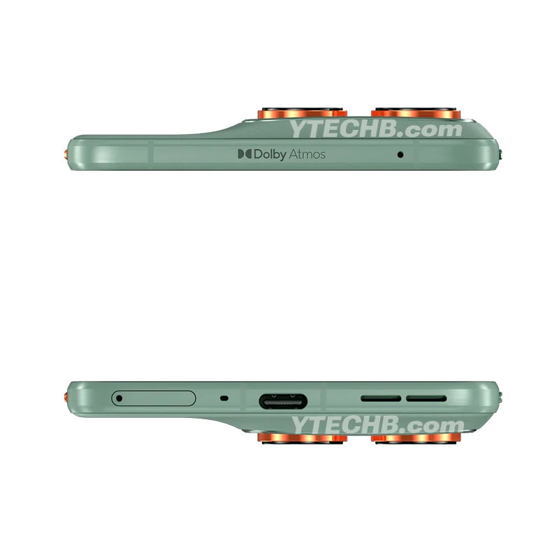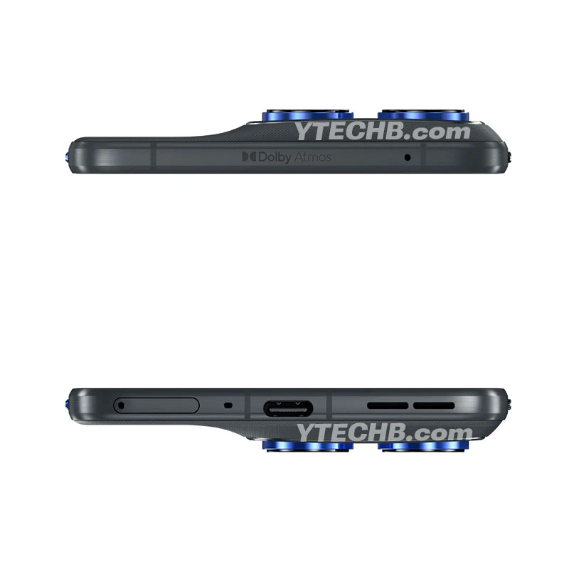 Le immagini mostrano la dicitura Dolby Atmos, indizio della presenza di speaker ottimizzati per l’audio spaziale. Spicca inoltre un tasto fisico dedicato, il cosiddetto Moto AI key, con accenti cromatici: verosimilmente offrirà accesso rapido a funzioni AI proprietarie, come ricerca contestuale, assistenza voce e automazioni. Resta da capire se le elaborazioni AI saranno on‑device o cloud‑based.