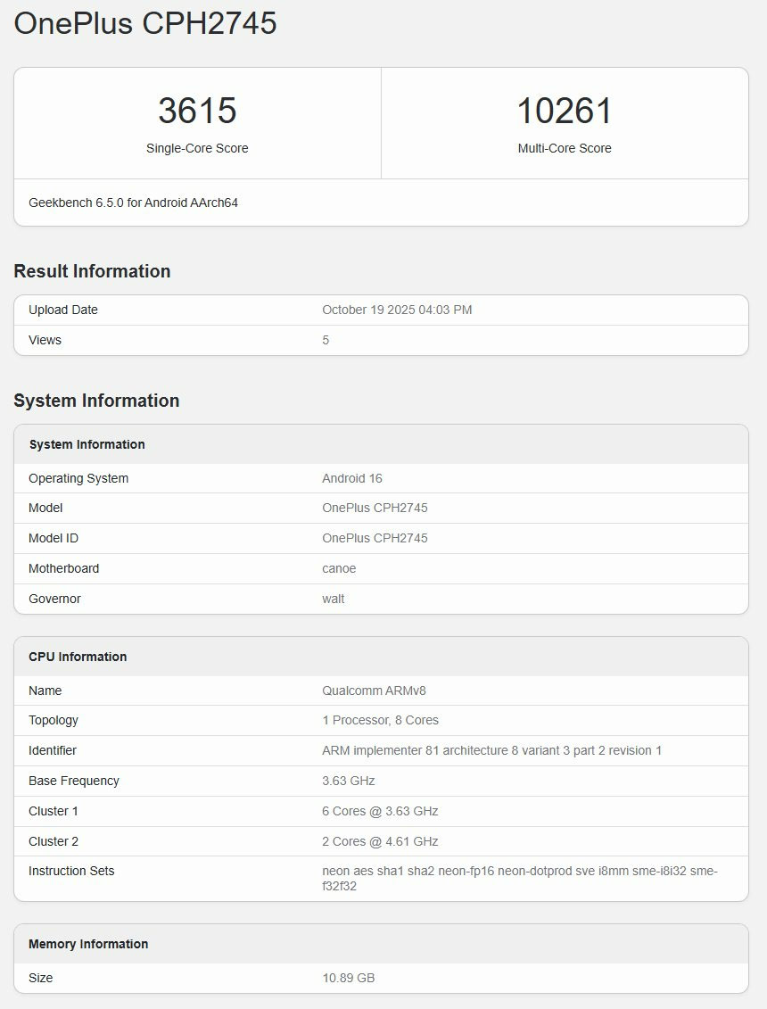 IlOnePlus 15 in versione global è apparso su Geekbench con il codice modello CPH2745, anticipando un lancio atteso a novembre. In Cina, l’annuncio dei nuovi top di gamma è previsto la prossima settimana, con la variante locale identificata come PLK110 e la linea parallela Ace 6. Oltre a CPH2745, sono emersi anche i codici CPH2747 e CPH2749 su piattaforme di certificazione come GCF, segnale che la distribuzione internazionale è in preparazione.