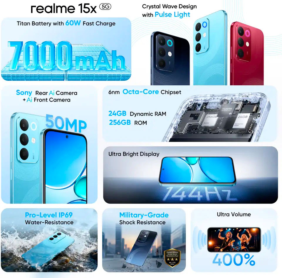 Il Realme 15x arriva in India nelle colorazioni Marine Blue, Aqua Blue e Maroon Red. È venduto sul sito ufficiale Realme, su Flipkart e presso negozi fisici.