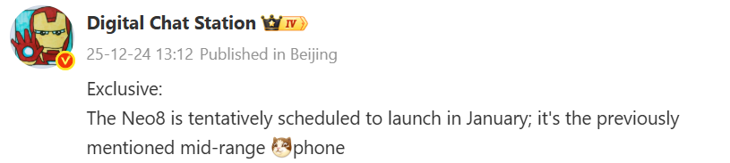 Secondo indiscrezioni affidabili emerse su Weibo, il prossimo Realme Neo 8 potrebbe debuttare in Cina a gennaio 2026. Le informazioni, attribuite al tipster Digital Chat Station, delineano una scheda tecnica orientata alle prestazioni, ma al momento non c’è conferma ufficiale da parte dell’azienda.