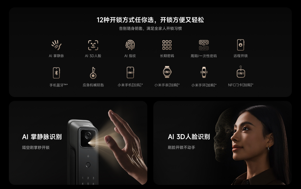 La serratura offre 12 modalità di sblocco, pensate per coprire sia l’uso quotidiano sia gli scenari d’emergenza. Oltre a AI venografia del palmo, AI riconoscimento facciale 3D, AI impronta digitale, password permanenti, password a tempo (periodiche o monouso), sblocco remoto, Bluetooth dallo smartphone e chiave meccanica di emergenza, sono supportati anche smartphone Xiaomi, smartwatch e smart band, oltre a NFC door card tramite accessori opzionali.