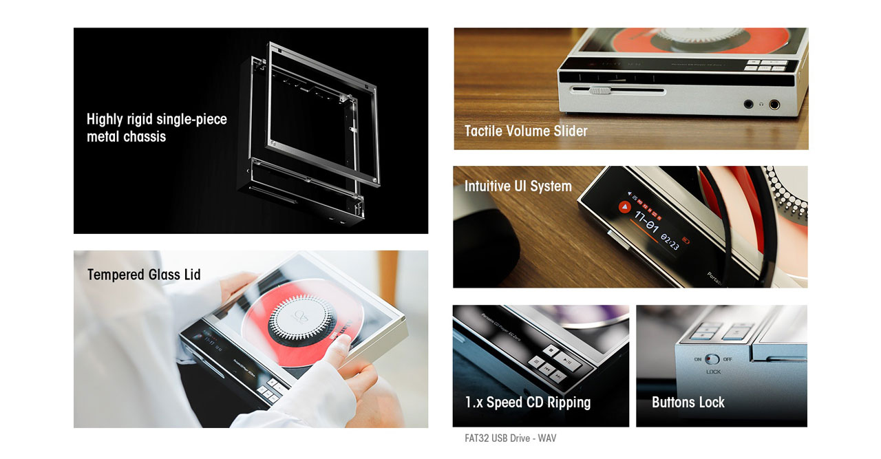 Tra le funzioni avanzate spiccano lo slider del volume tattile e un’interfaccia utente intuitiva, pensata per un accesso rapido alle sorgenti e alle impostazioni. È presente il ripping da CD verso unità USB in FAT32 alla velocità 1x in WAV, utile per archiviare i propri dischi in formato non compresso. La custodia opzionale in PU leather aggiunge protezione durante il trasporto.