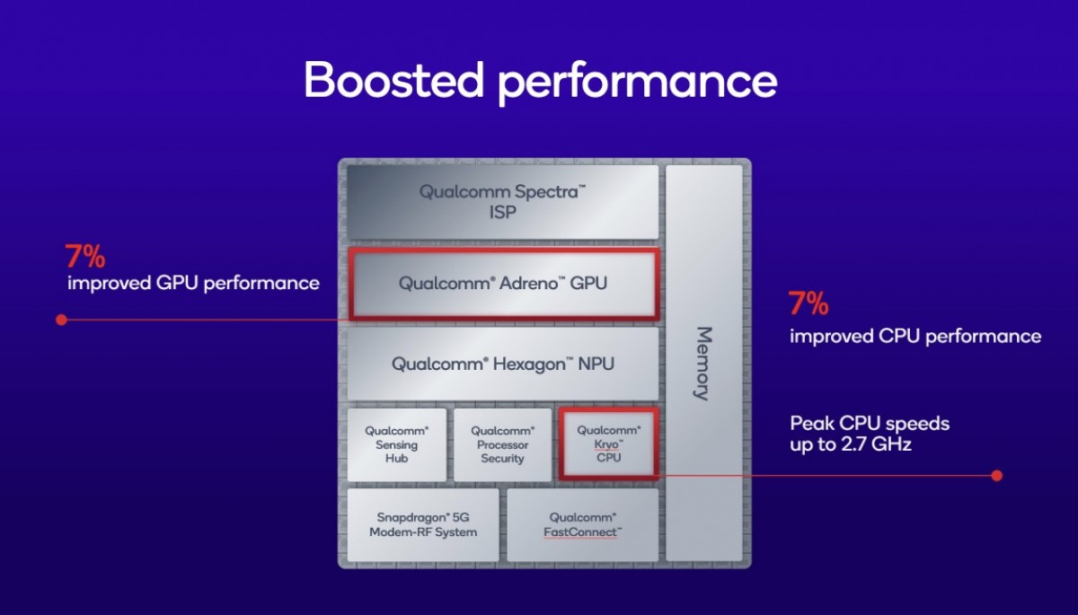 Lo Snapdragon 7s Gen 4 evolve la piattaforma precedente mantenendo il nodo a 4 nm e il layout CPU Kryo 1+3+4. Il core Prime Cortex‑A720 sale a 2,7 GHz (rispetto ai 2,5 GHz del 7s Gen 3), affiancato da tre Cortex‑A720 a 2,4 GHz e quattro Cortex‑A520 a 1,8 GHz. Secondo Qualcomm, il guadagno si attesta intorno al +7% nelle attività CPU.